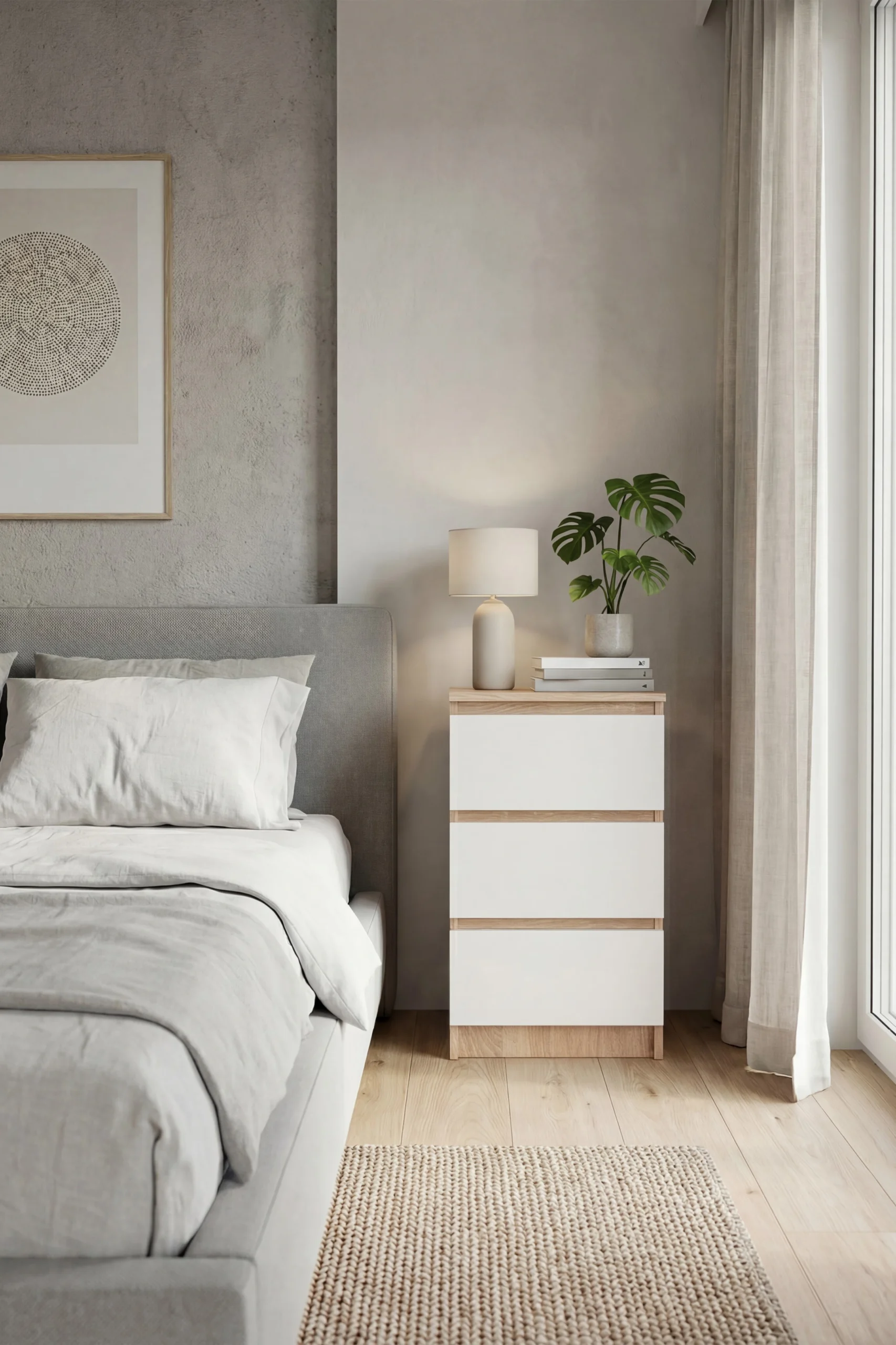 Kompaktowa i funkcjonalna – Komoda Alani 1 to idealne rozwiązanie do sypialni, salonu, biura czy przedpokoju. Wyposażona w 3 pojemne szuflady, pozwala na wygodne przechowywanie ubrań, dokumentów i drobnych akcesoriów.