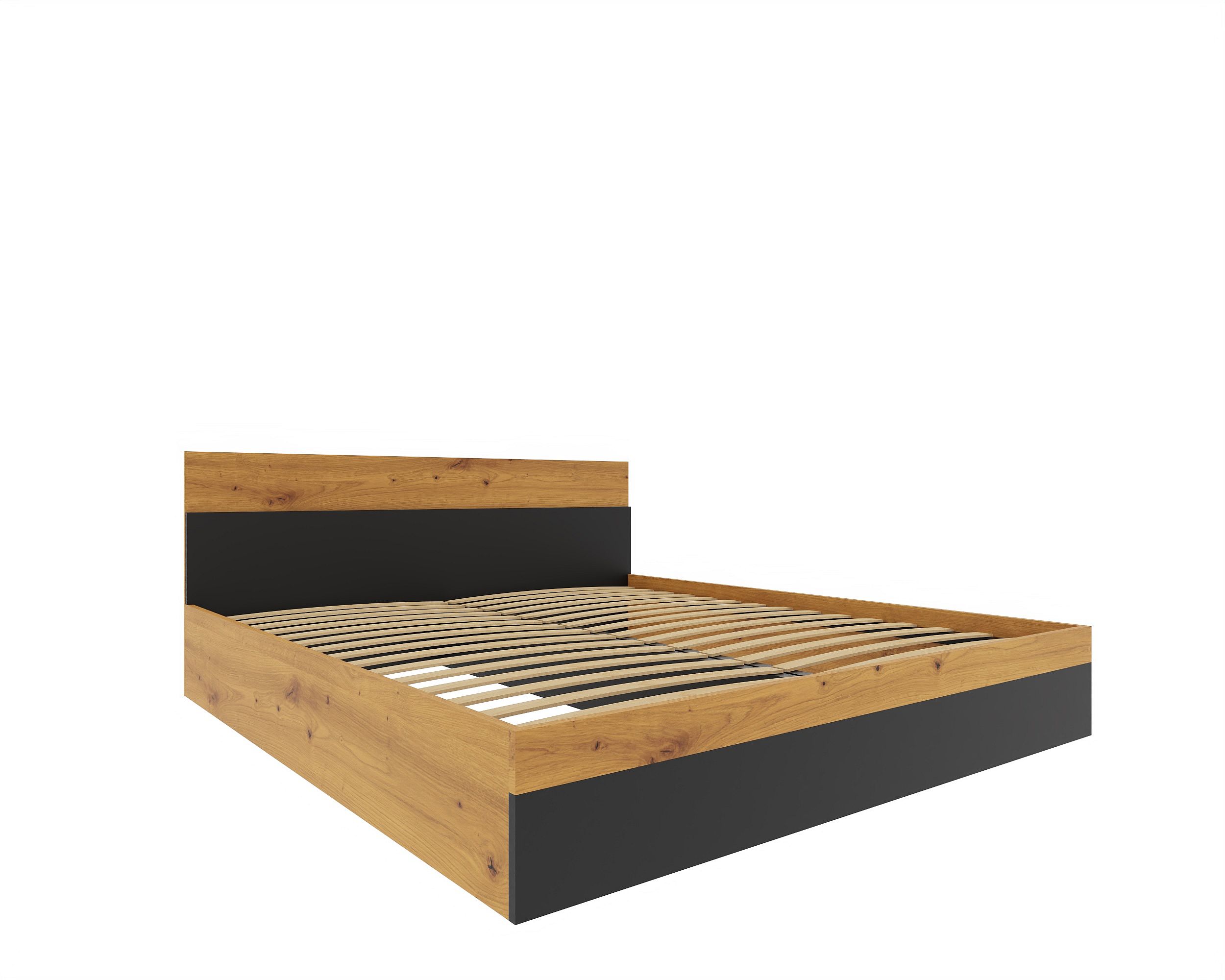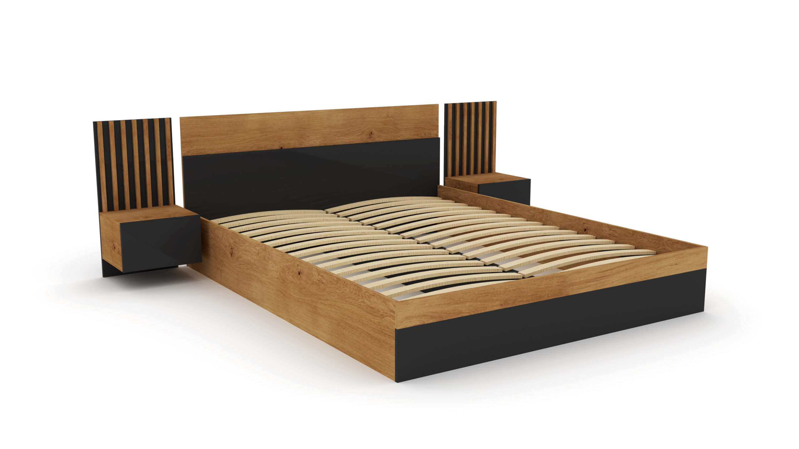 Wprowadź do swojej sypialni elegancję i funkcjonalność dzięki tej wyjątkowej ramie łóżka z panelem zagłówkowym i zintegrowanymi stolikami nocnymi. Stylowe połączenie ciepłego odcienia drewna z matową czernią tworzy ponadczasowy, nowoczesny design inspirowany stylem loftowym. Pionowe lamele po bokach dodają całości lekkości i charakteru, a zintegrowane szafki nocne zapewniają praktyczne miejsce do przechowywania.