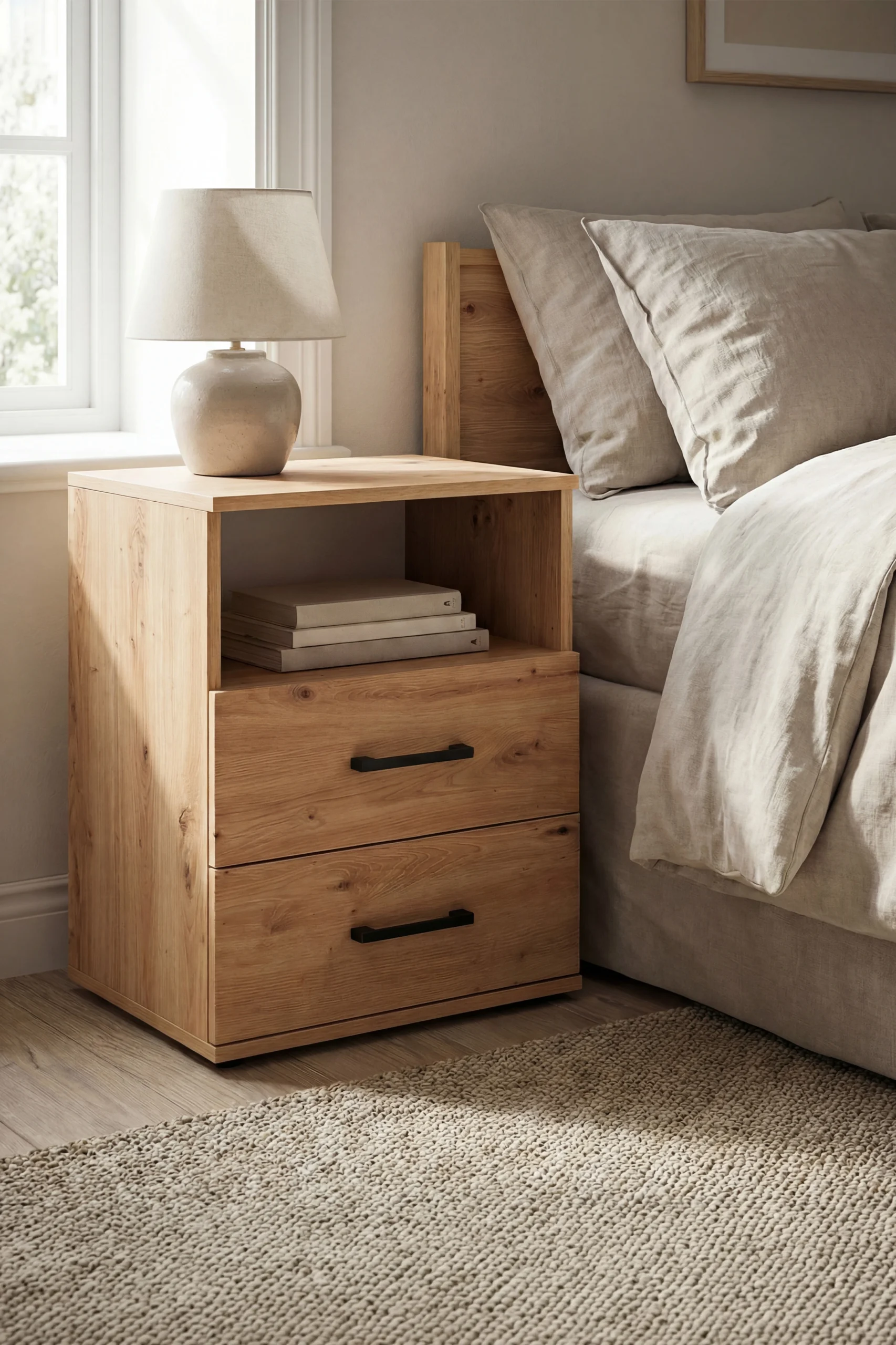 Stolik nocny GODA 3 2S idealnie sprawdzi się w sypialni, jako miejsce do przechowywania podręcznych przedmiotów. Możesz postawić na nim lampkę nocną, odłożyć książkę czy telefon. Dzięki swojemu uniwersalnemu designowi, pasuje do różnych stylów wnętrz.